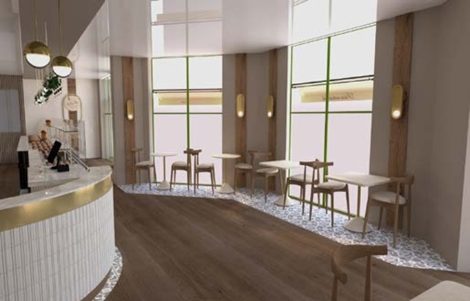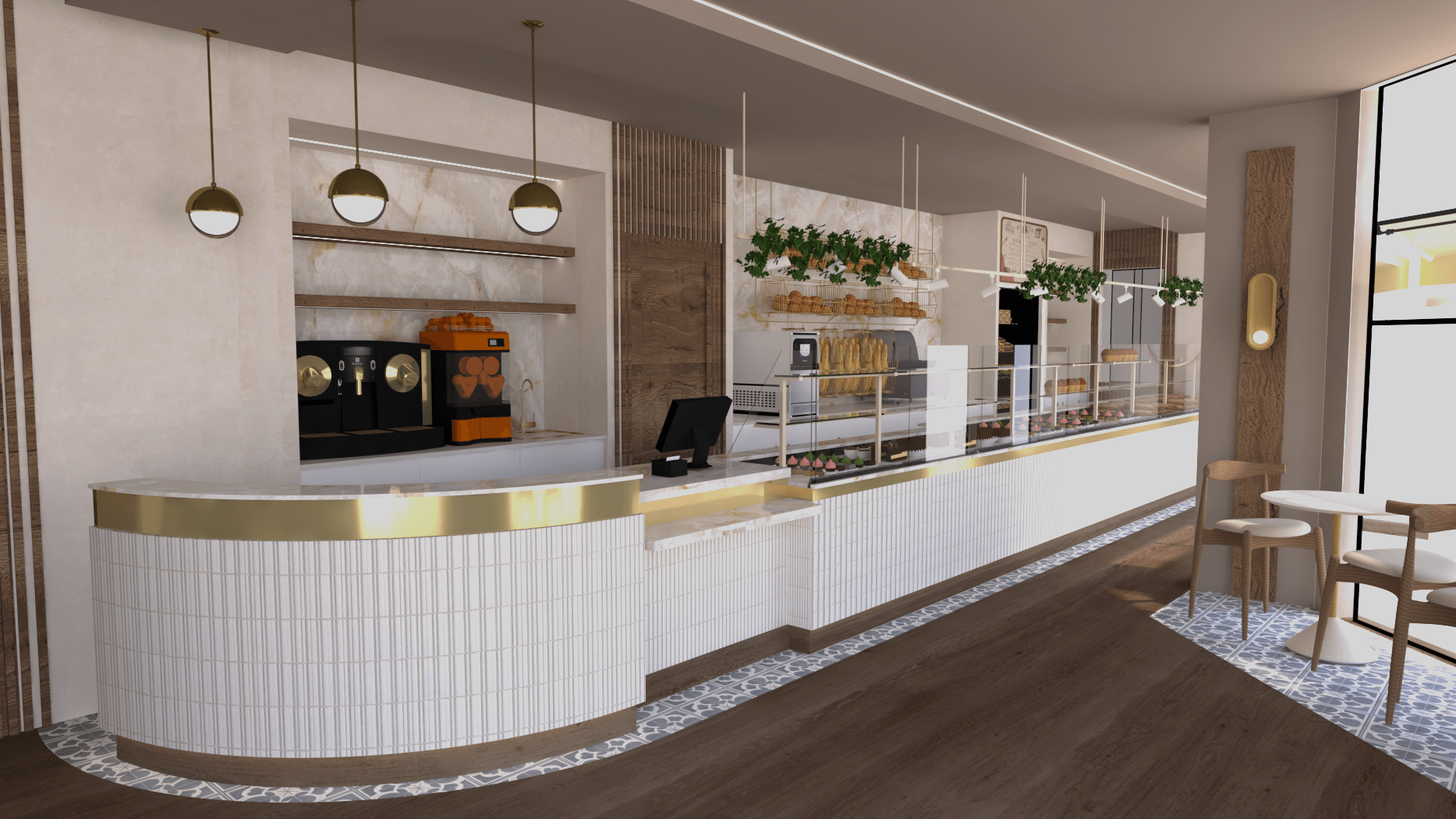 The client had a very clear vision: they wanted the bakery to exude warmth, conviviality, and refinement. To meet this requirement, I worked with a carefully selected palette of materials. Wood, used for the furniture and certain architectural elements, provides a natural and inviting texture. White, omnipresent, offers a bright and clean base that accentuates the cleanliness and brightness of the space. Finally, the marble with its golden veins introduces a touch of understated sophistication, while reinforcing the overall elegance of the space.